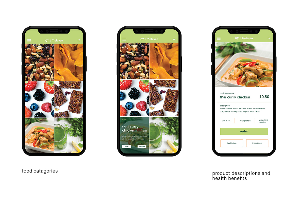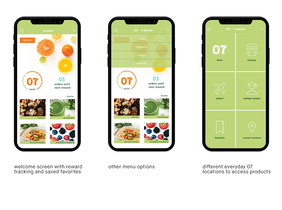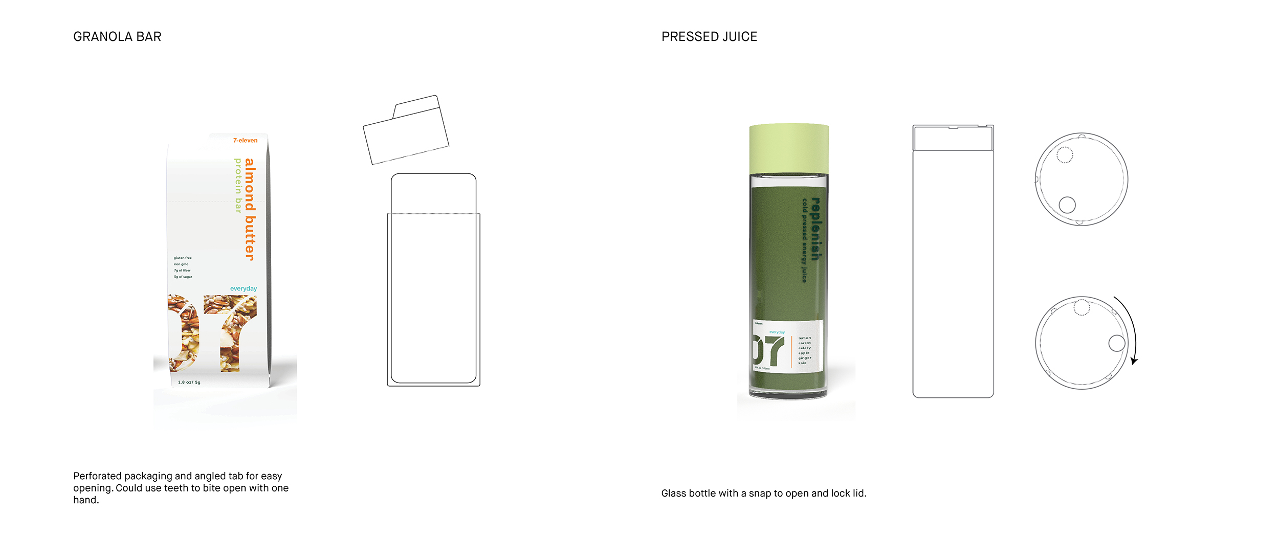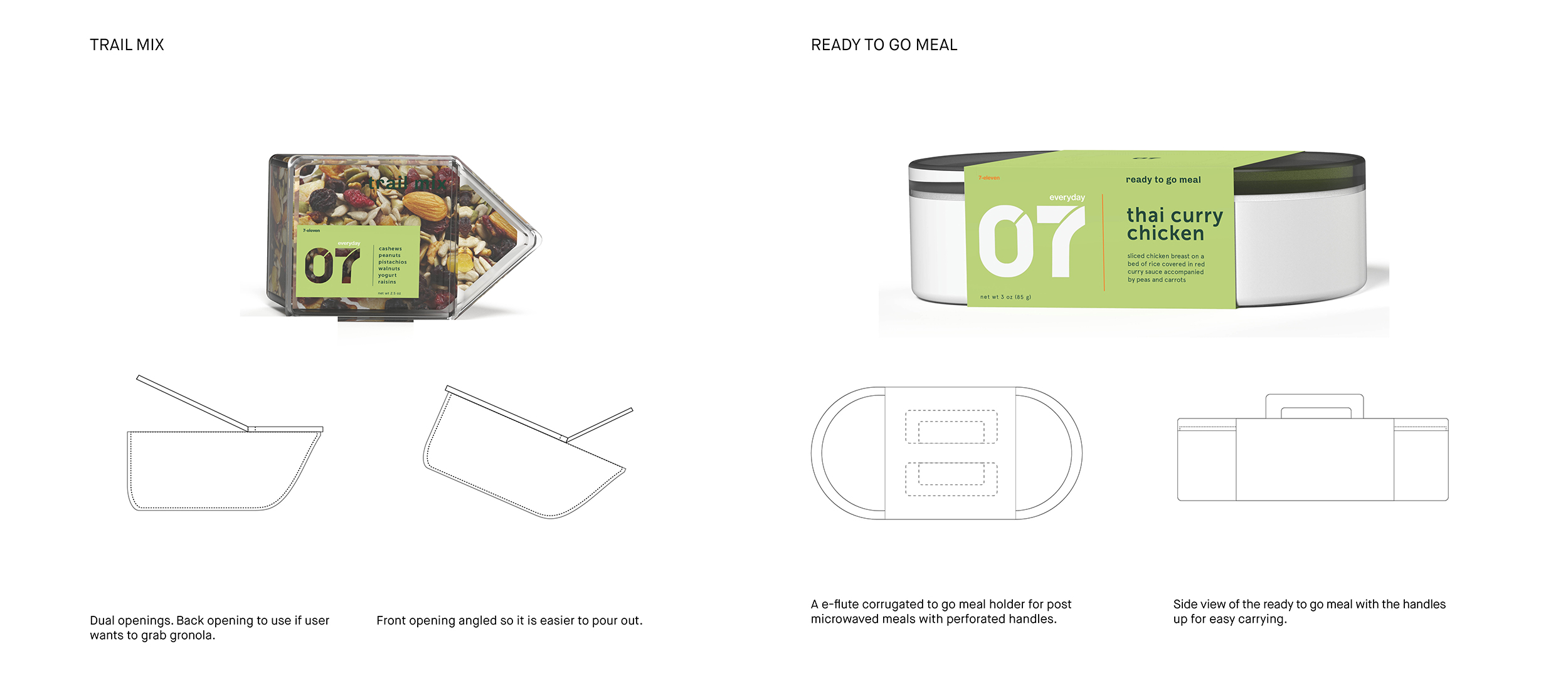 Inspired by the target audience of young professionals, the line speaks to a health conscious person and is created with ease of usage both with location and packaging in mind. Everyday 07 is able to provide accessibility to fresh and healthy food for those who have a busy lifestyle or neighborhoods where it is a food desert. The visual identity speaks to the transparency of natural and healthy ingredients that goes into Everyday 07 products. This is shown in through product design, consumer packaging, digital kiosk, and mobile extension.